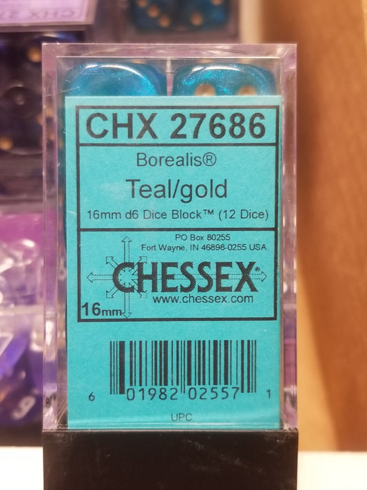 CHX 27686 16mm Block Borealis Teal w/ Gold Pips Dice Set Chessex