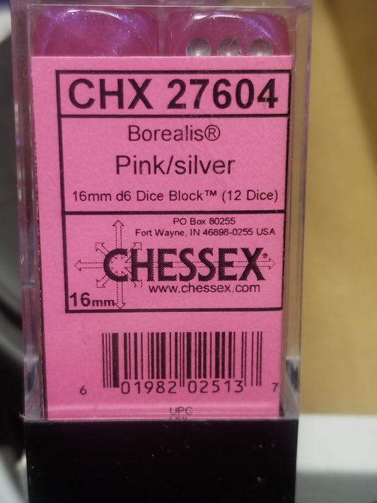 CHX 27604 16mm Block Borealis Pink w/ Silver Pips Dice Set Chessex