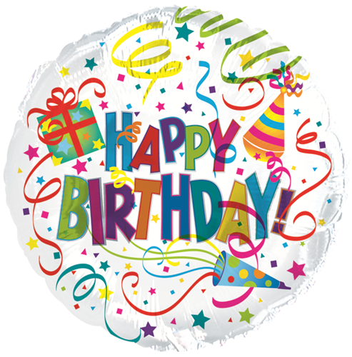 18 inch Foil Mylar Circle Happy Birthday Party Hat and Horn Balloon - Happy Birthday message with a party hat, horn and streamers on a white background.