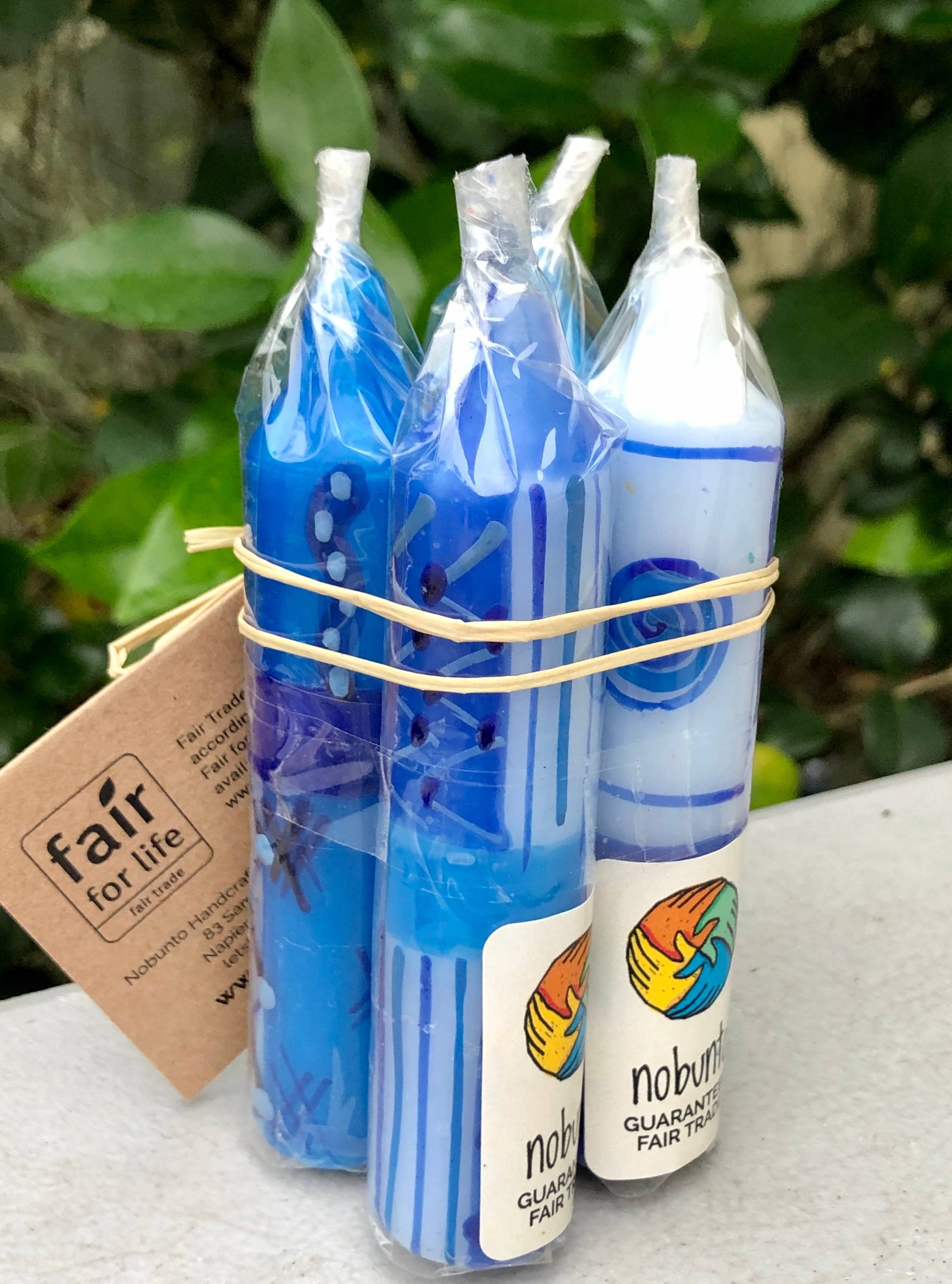 "Feruzi"symbolizes two oceans unite wildly and stormily at Cape Agulhas. The different colors of the Indian and Atlantic oceans mix in huge wave mountains. You can almost feel the fresh breeze and the salt on the skin. Set of 4 Short Tapers, ideal for Friday Night Shabbat Dinner. Candles measure approximately 5-inches tall. Unscented, high-quality, fully-refined paraffin wax from Germany. Non-toxic color pigments and natural wicks. Individually hand-painted. Designs will have differences, but will be consistent in colors and icons that reflect the style. Creates a calm ambiance that transforms any space into a personal sanctuary. Burn time maximum 4 hours. High melting point of 58°- 60°.