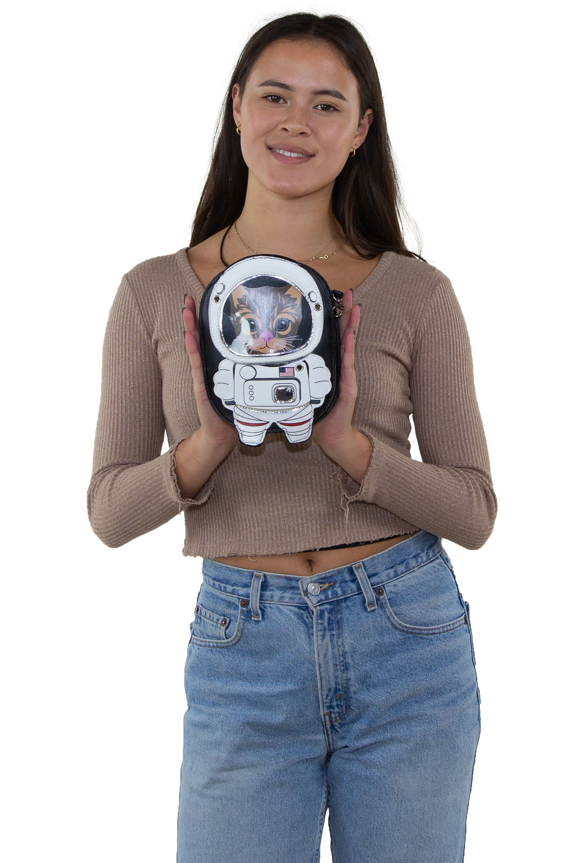 Crafted with imaginative detail, this crossbody bag features an adorable cat dressed in an astronaut suit. The design captures the charm of both cats and outer space exploration, with the cat donning a helmet and space suit.