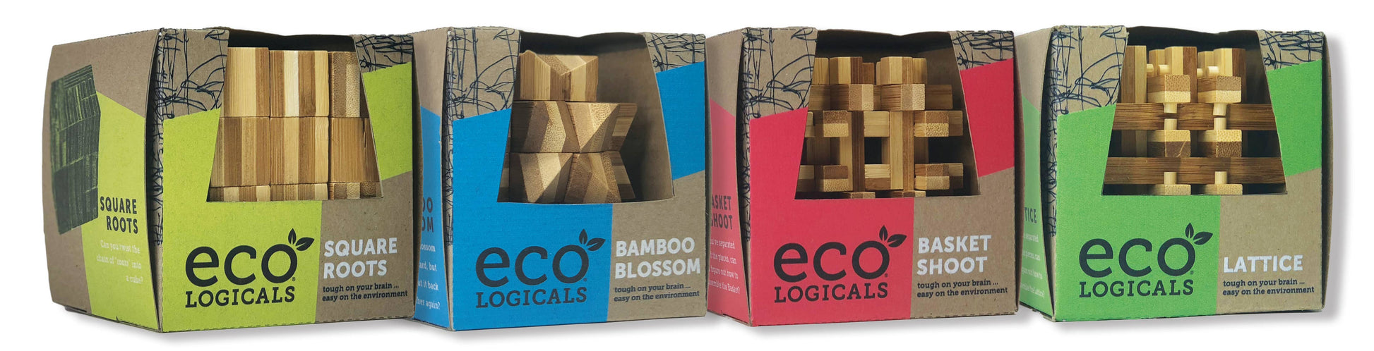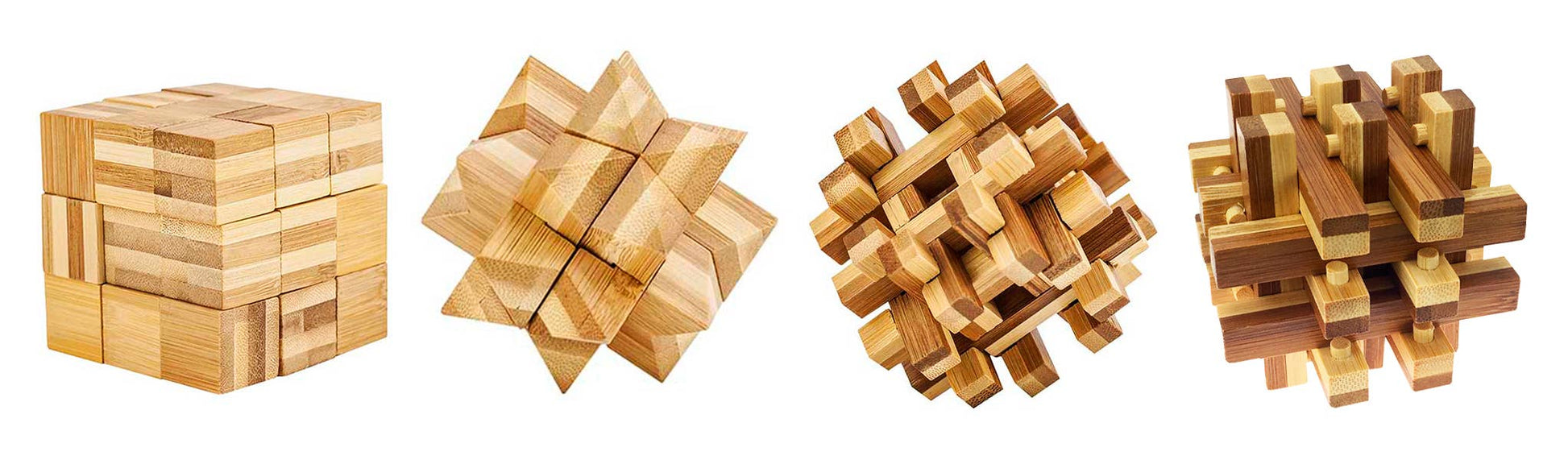 Bamboo brainteasers with a variety in difficulty levels and puzzles. Lattice, Bamboo Blossom, Basket Shoot, and Square Root.