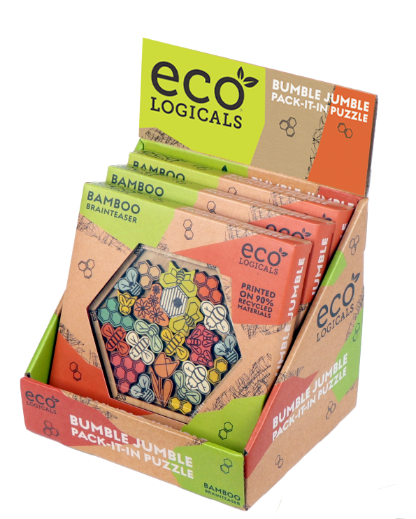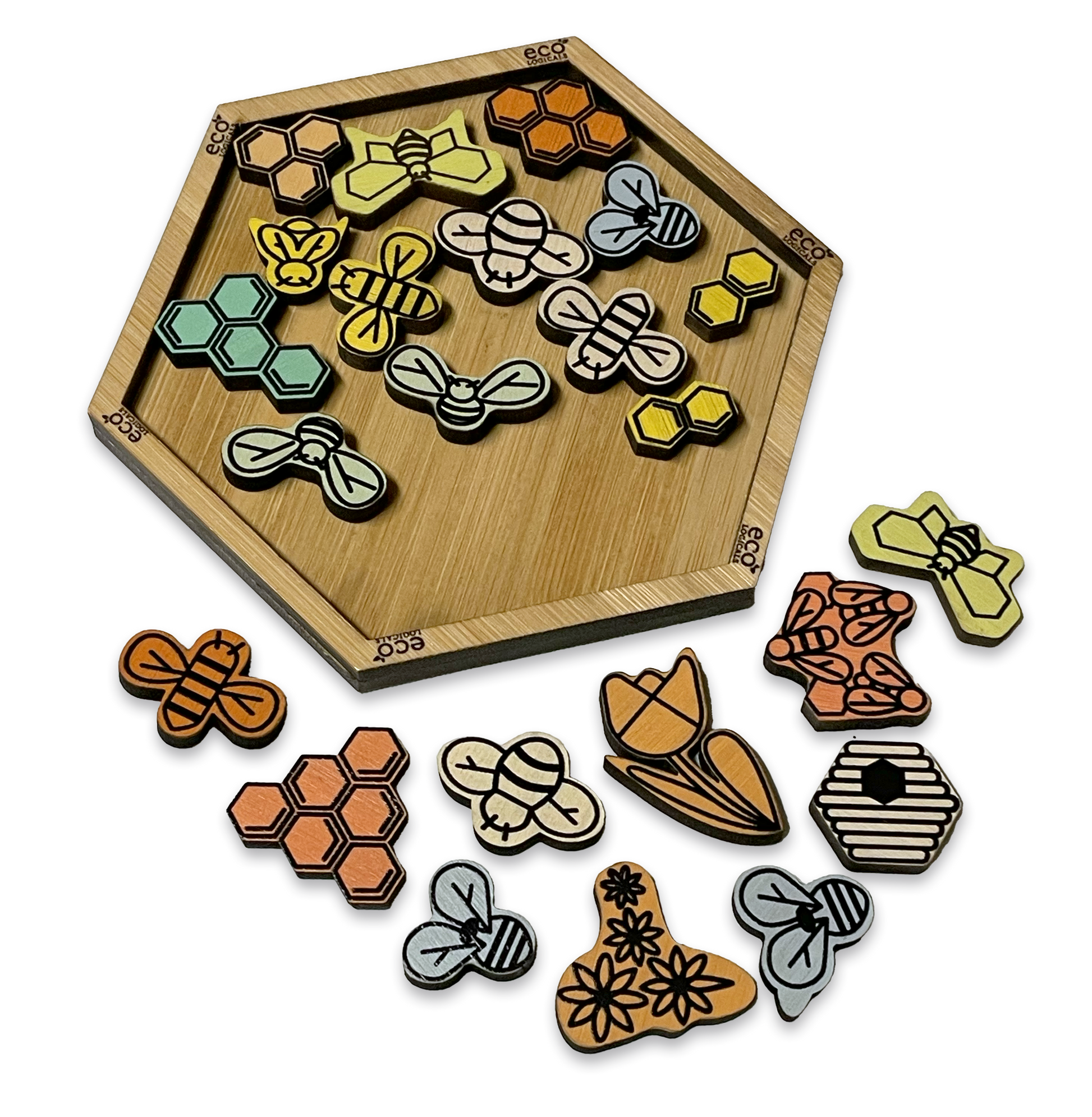 Pack-it-in style puzzle made entirely of bamboo. Arrange the pieces so that all bees fit into the hive.