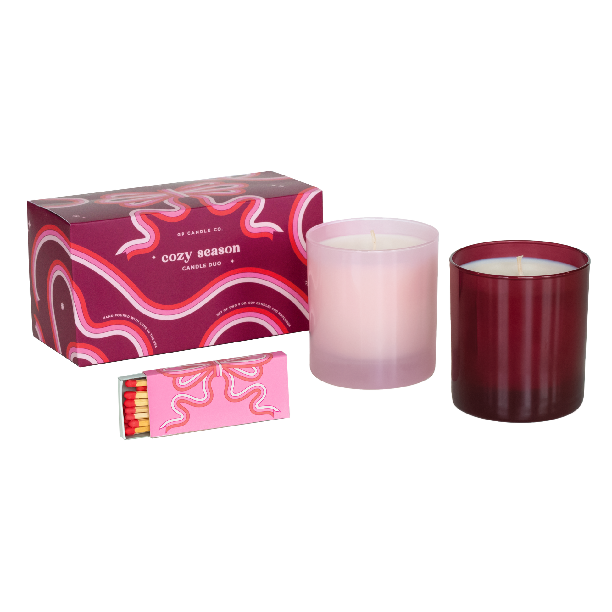 The Cozy Season Candle Duo includes two 9 oz. candles, Rouge and Glow, plus a 3" bow matchbox. Packaged in a burgundy, red, and pink bow patterned gift box.