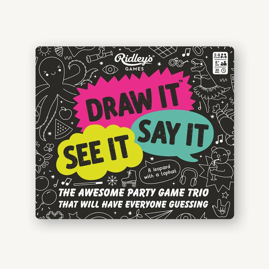 Draw, memorize, or bluff your way to victory in Draw It, See It, Say It from Ridley's Games! In this awesome party game trio that will have everyone guessing, there's three ways to play: drawing, seeing, or saying. Roll the dice and take a category card that matches the color shown on the dice. Pink means it's time to test your artistic skills, and the player then needs to draw one of the two prompts (easy or hard) with all other players guessing what it is.
