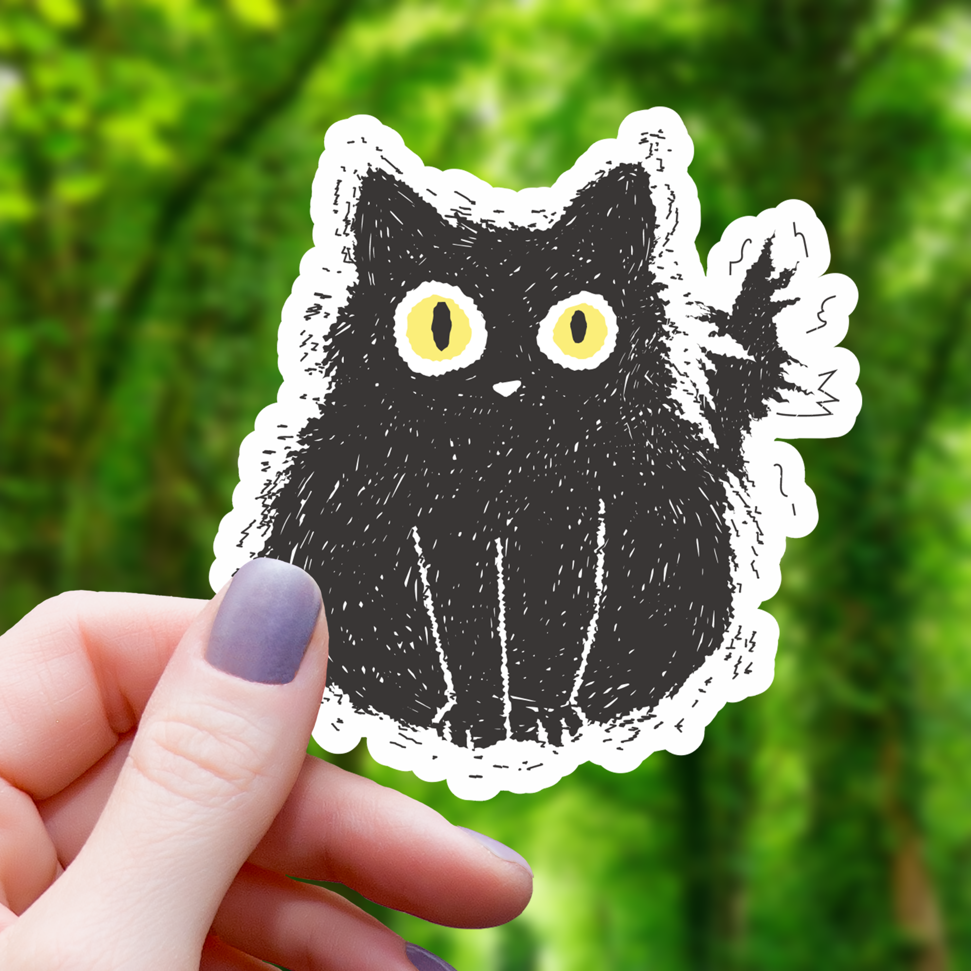 Electrified Black Cat Sticker. Each sticker is printed on high-quality vinyl sticker paper using only the best inks. Stickers measure 3" on the longest side! Our stickers are durable and waterproof and work just as well being placed outdoors as in. They make great additions to water bottles, laptops, or just about anything else with a clean flat surface to stick to.