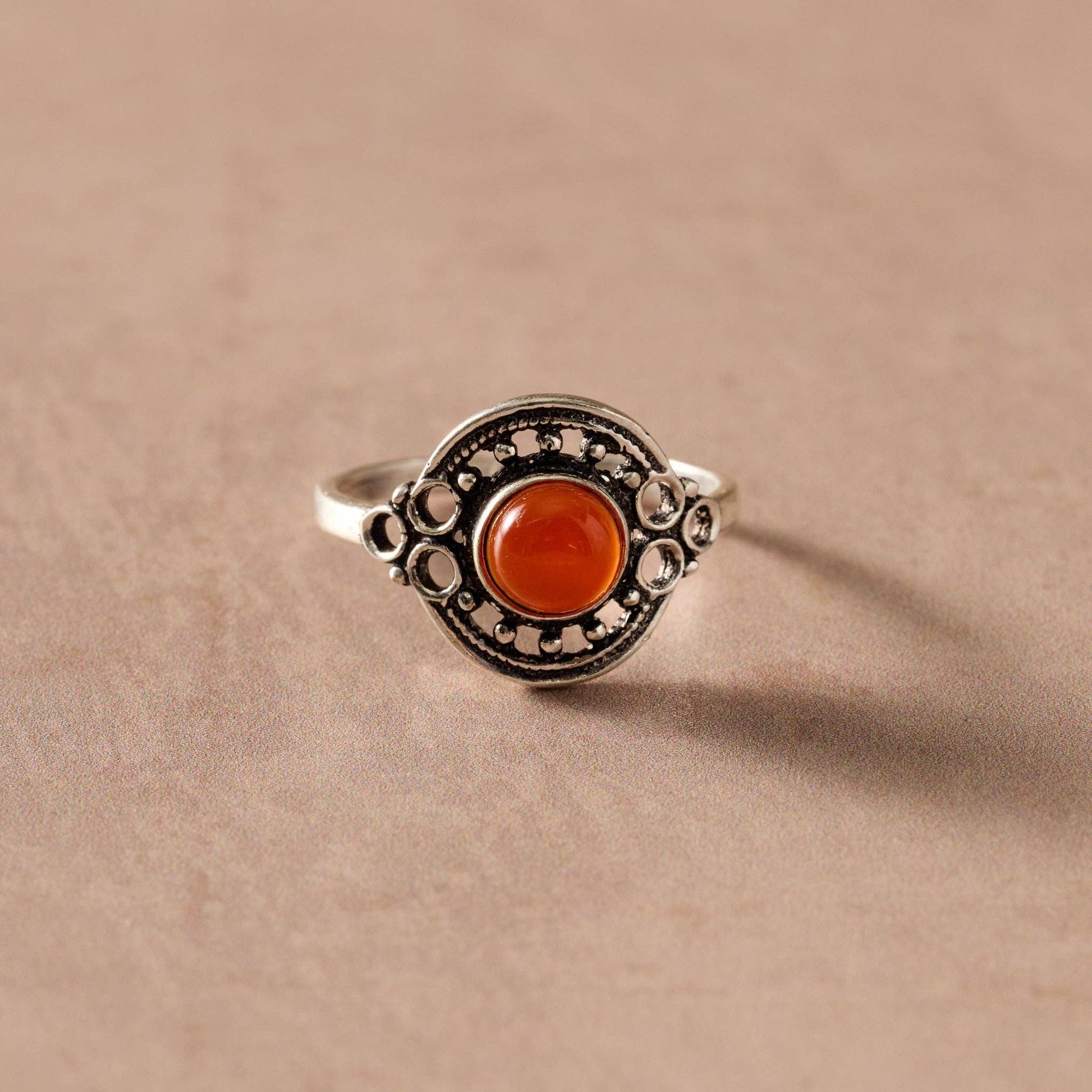 Add a touch of elegance to your jewelry collection with this fabulous ring! The beautiful design features a circular ornate design and a stunning red onyx stone in the center. Made from silver colored oxidized electroplated brass, this ring is both stylish and adjustable for the perfect fit. Enhance your look with this versatile must-have accessory. A Ten Thousand Villages Exclusive handcrafted in India.