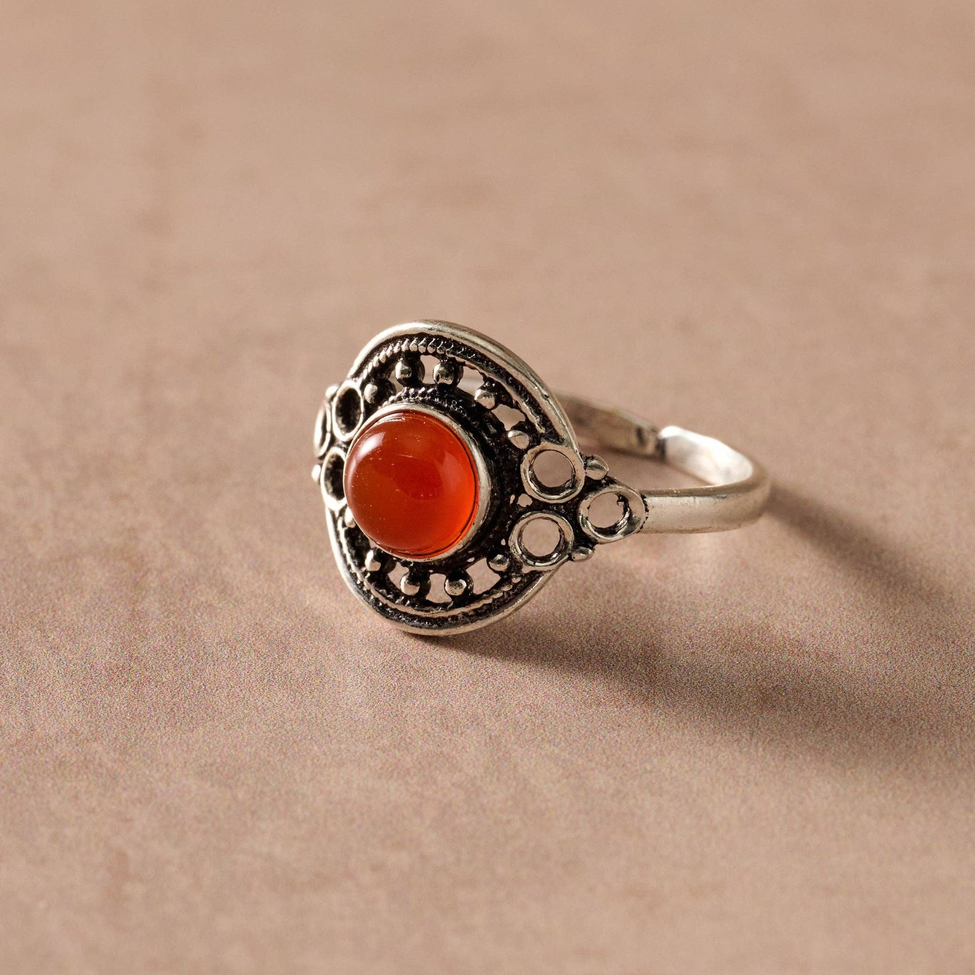 Materials: Silver Colored Oxidized Electroplated Brass, Red Onyx Stone - Measures: .75"D Adjustable x .5"W, Red Onyx Stone: .2"D - Colors: Silver, Red - Care: Avoid chemicals, store in dry place - Handcrafted in India
