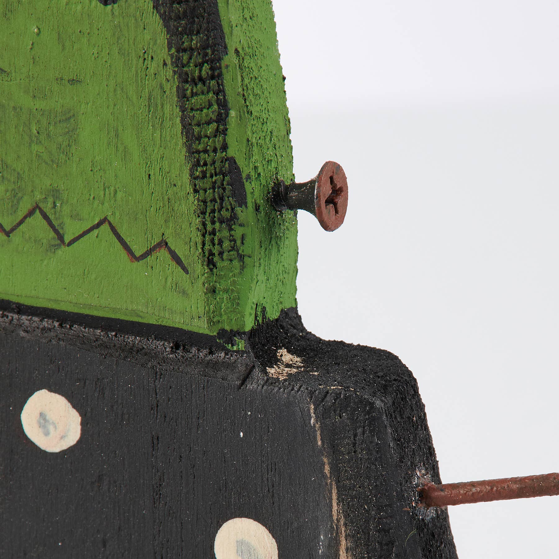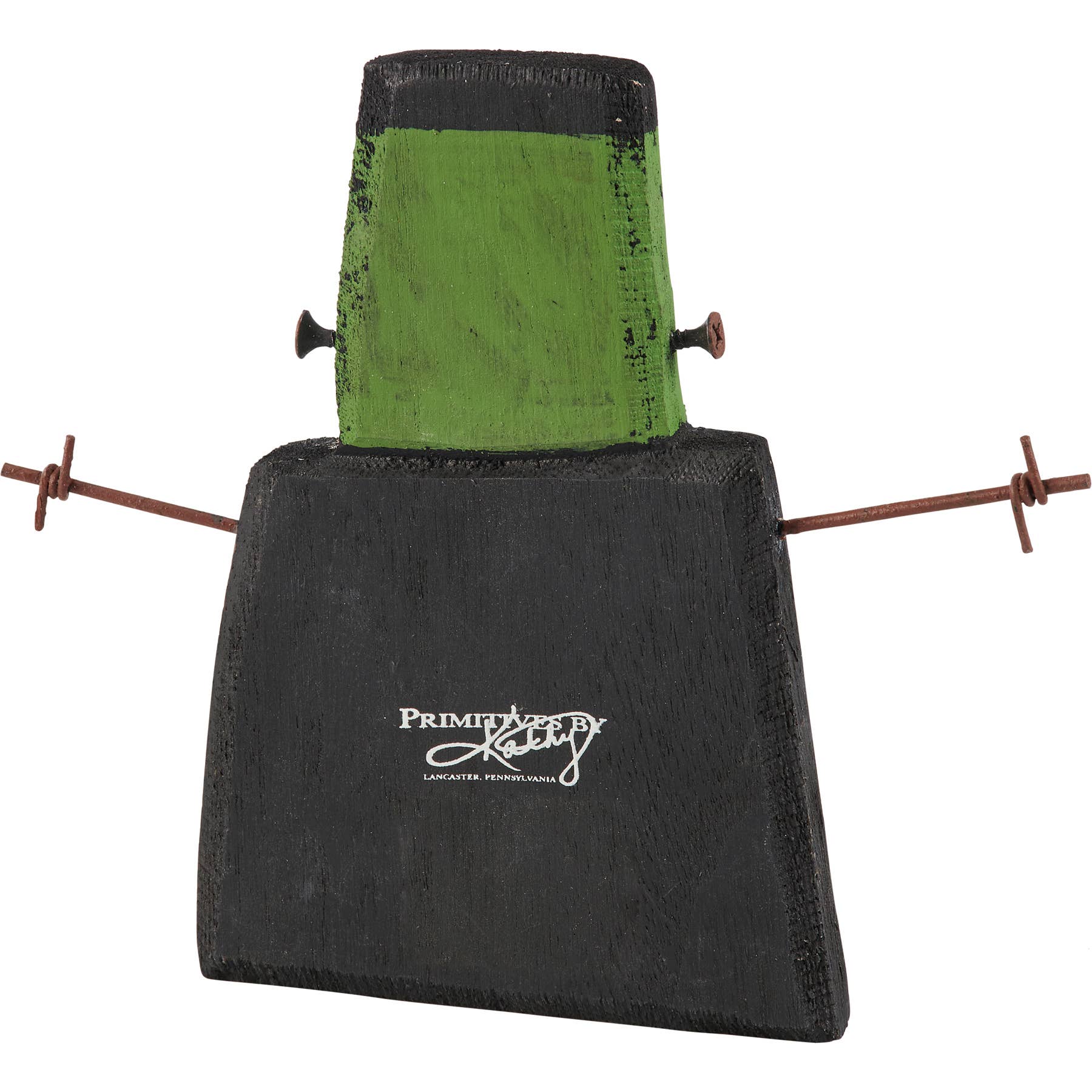 A wooden sitter displaying a green monster recreated from an original hand carved and painted piece with distressed details. Sitter features twisted wire and screw accents to create a handmade feel. Our Monster chunky sitter is designed to free-stand alone on flat surface. A fun seasonal home accent that adds character to any display.
