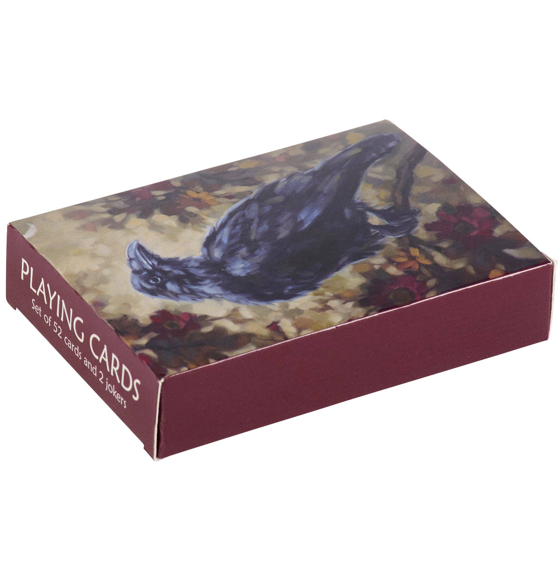 A 54-card playing deck from our Dark Academia Collection displaying a moody raven at night design in a hand painted style on the back of each card. Our Night Raven playing cards are packaged in a protective carboard box case displaying the full art for easy storage when not in use or traveling. A stylish accessory perfect for gifting and on the go games.