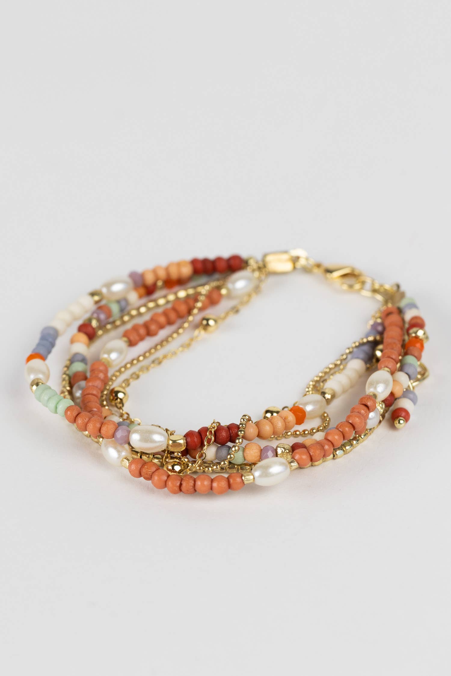 Made from reclaimed animal bone in organic, peachy colors, metal beads, and pearls, the Peachy Multistrand Bracelet exudes a beach‒ready vibe that is perfect every day of the year. This six‒strand bracelet has a subtle yet sophisticated edge that will enhance any outfit. Handcrafted in small batches by artisans in India with TARA Projects, working with hundreds of artisans: paying fair wages, providing medical insurance, interest‒free loans and advances, a savings program, and skills training.
