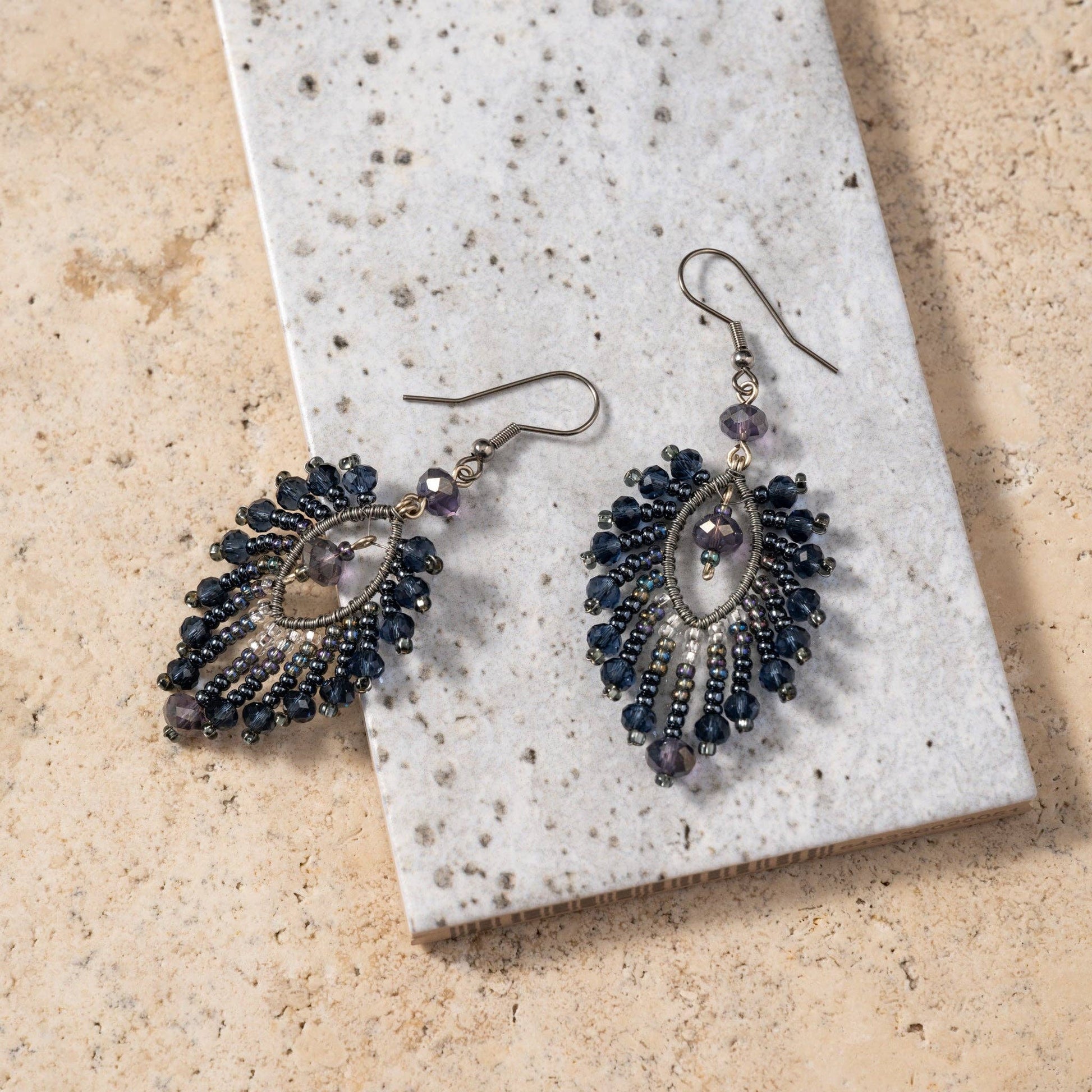 Beautifully crafted with glass beads and stainless-steel hooks, these earrings feature teardrop-shaped wire cradling cascading strands of blue and gray beads. Each line graduates in length to create graceful movement and balance. At the center, a suspended blue bead framed by silver spheres catches the light with every turn. Materials: Glass Beads, Stainless Steel Hooks - Measures: 2.75"L - Colors: Blue/Gray, White, Silver - Handcrafted in Guatemala