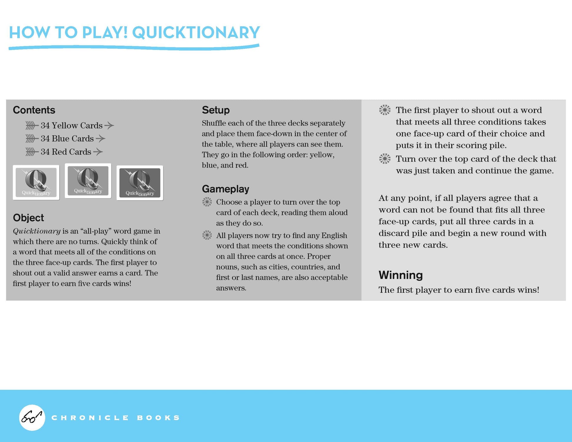 Introducing a new, fast-paced casual card game for word lovers and anyone who loves to think on their feet. Simple to learn, with nearly endless possibilities, this free-for-all game is a fun addition to any game night. For 2+ players, ages 12 and up. Includes: 102 cards, rule book