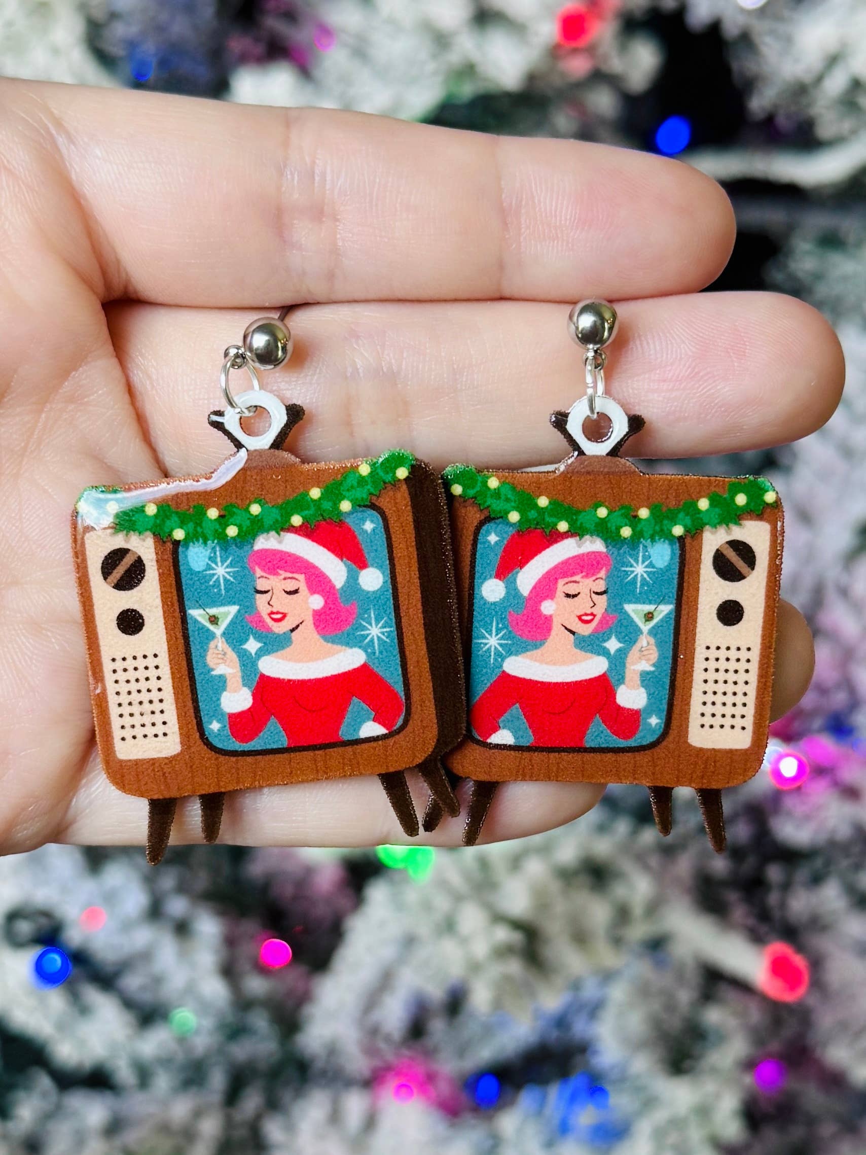 Retro Vintage Santa TV Martini Christmas Dangle Earring