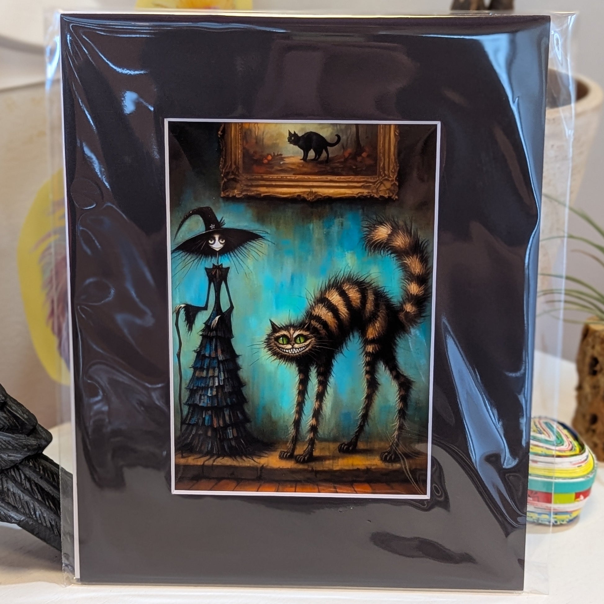 A high-quality matted print of a witch in a dress and her cat with a Cheshire grin posing in front of a cat painting, perfect for easy framing. 8 x10" with matte.