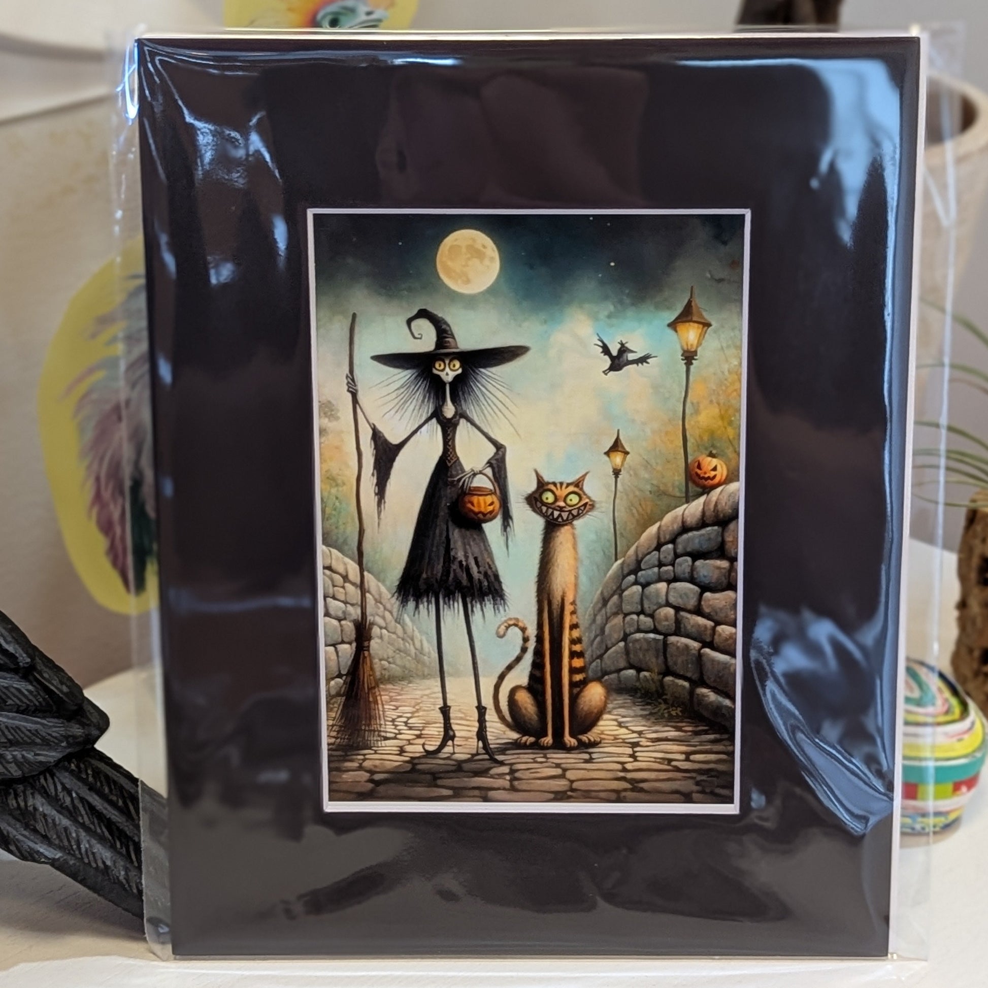 A high-quality matted print of a witch in her finest attire and her big cat standing on a bridge, perfect for easy framing. 8 x10" with matte.